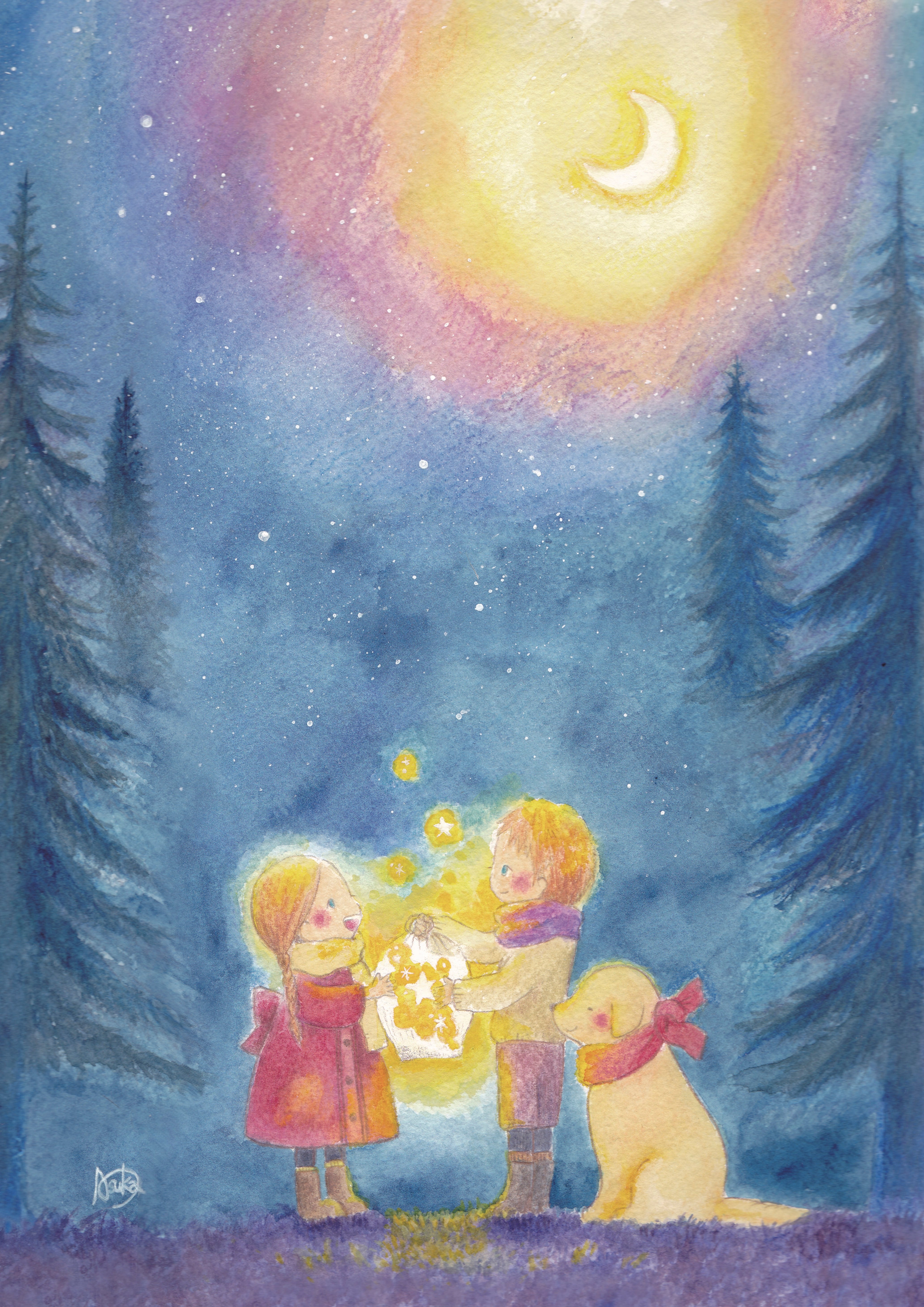 明かり代わりにした星たちを夜空に返しているところ